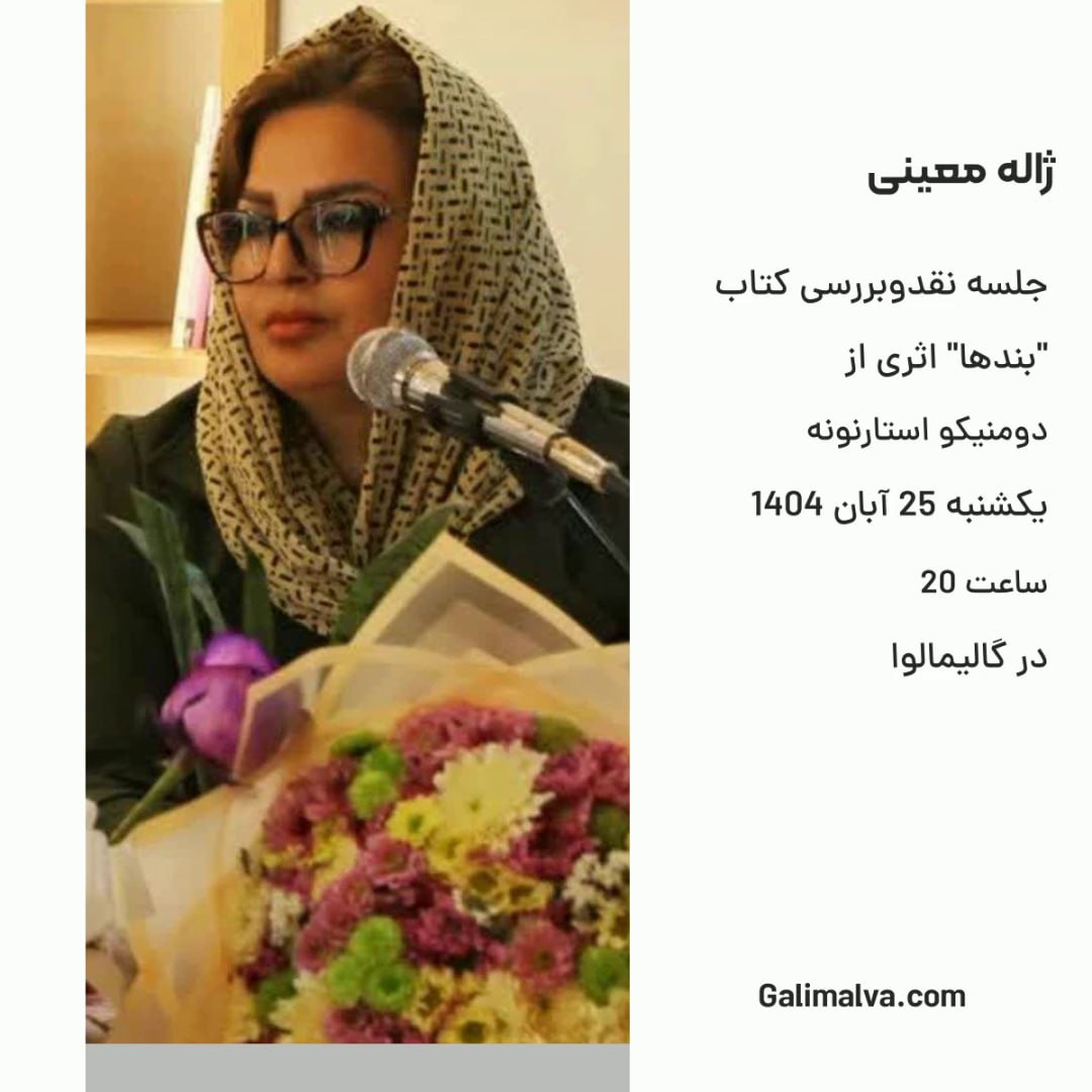 در این جلسه به نقد و بررسی کتاب بندها اثر دومینیکو استارنونه، باحضور سرکار خانم ژاله معینی نویسندهی معاصر میپردازیم.